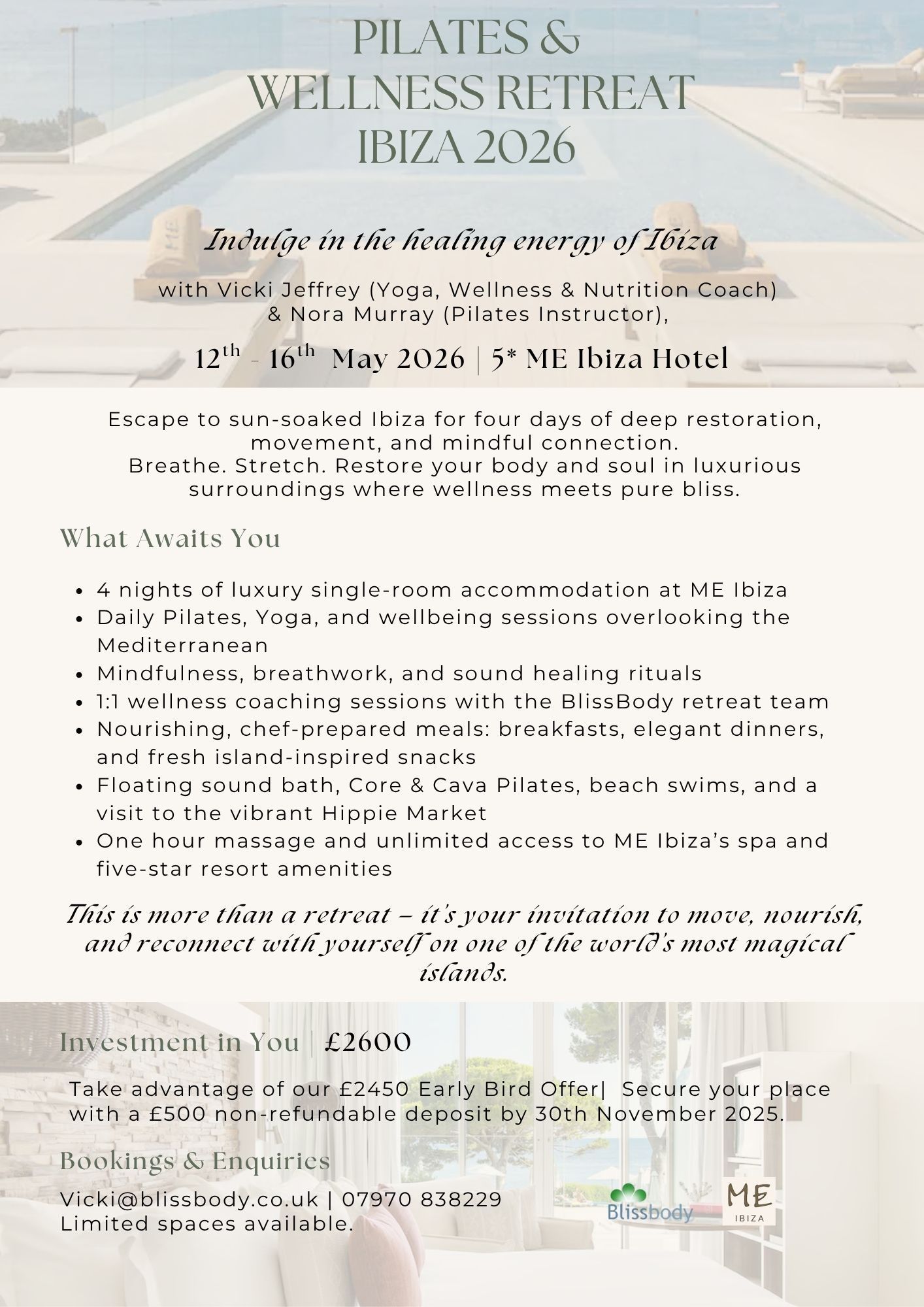If you are interested in joining us on this exclusive retreat, please contact vicki@blissbody.co.uk or DM/Call 07970 838229 to secure your space!